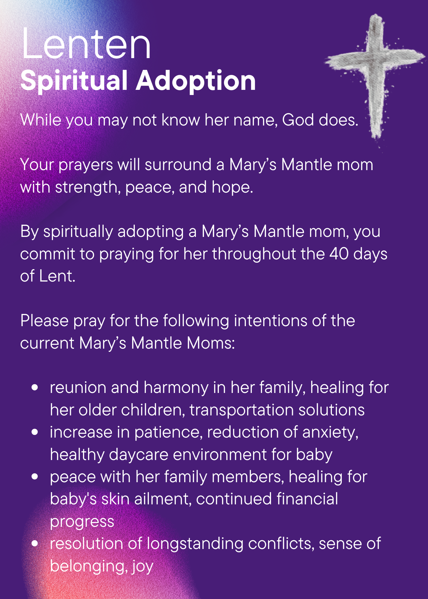 Mary’s Mantle is a supportive housing program which provides a safe place for pregnant women and for those same new moms and babies in their first seasons together. We offer a variety of services including case management, emotional and spiritual support, transportation, access to community resources, and parenting education. We also provide ongoing support to past residents.